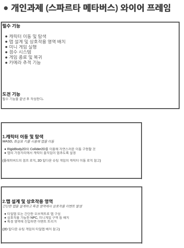와이어프레임이라고 하기 민망할 정도지만 지금부터 프로젝트의 전체적인 틀과 그 안의 세부 구성을 파악하고 계획을 짜는 연습을 해야 이후의 분량 배분과 마감, 작업속도 조절에 큰 도움이 되지 않을까.