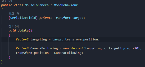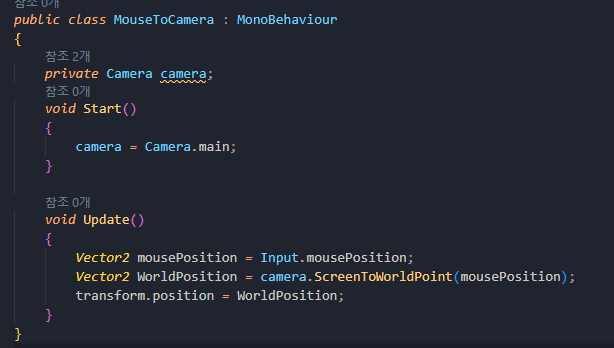 카메라 타입 변수를 선언하고 변수에 메인 카메라를 넣고 업데이트에서 마우스 위치를 카메라 위치로 바꿀 수 있게 했다.