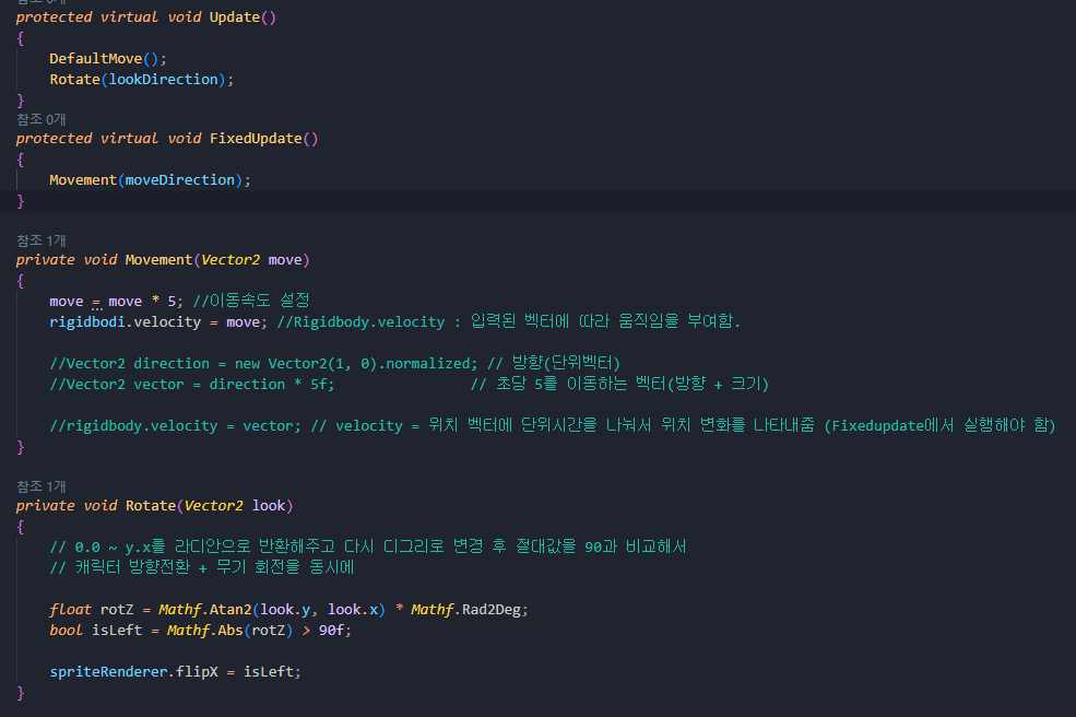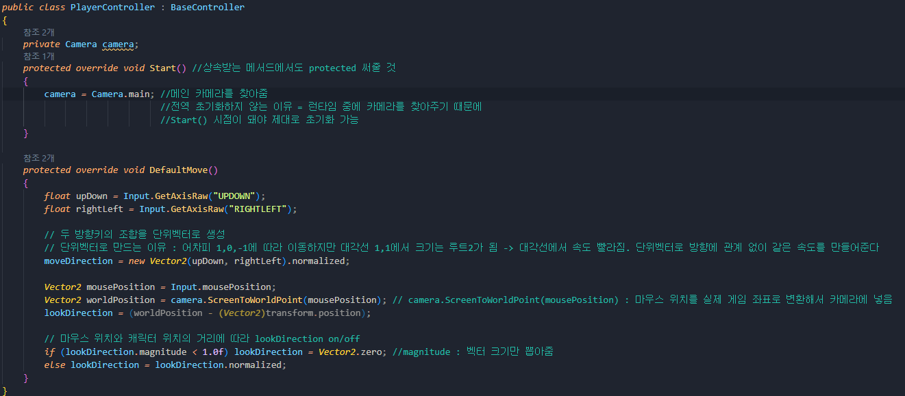 캐릭터 이동에 관련된 스크립트는 강의 내용을 토대로 BaseController로 기본적인 틀을 만들고 playerController에 상속해서 사용했다.