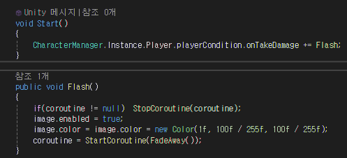 기본 형태는 player.onTakeDamage += FlashUI; 이지만 싱글톤을 통해 참조 가능하게 한 형태이므로 조금 길다.
