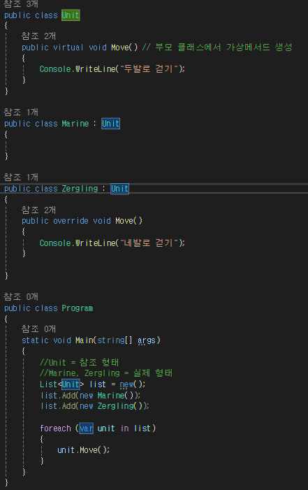 부모 클래스의 멤버를 virtual(가상)으로 만들고 자식 클래스의 멤버를 override(덮어쓰기)해서