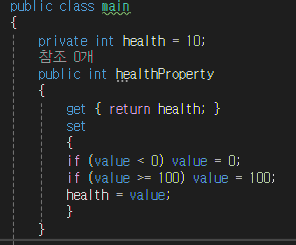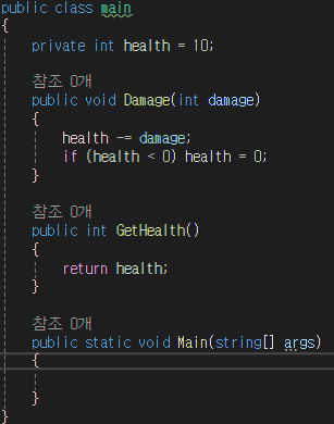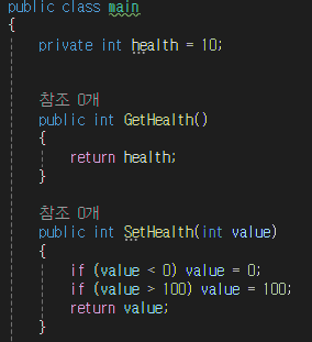 health를 private으로 선언해서 클래스 내에서만 수정할 수 있게 만들고 다른 public 메서드를 통해서만 바꿀 수 있게 만듦 <= 외부에서 접근 불가