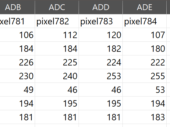 28 * 28 픽셀, 총 784픽셀로 이뤄져 784행까지 존재