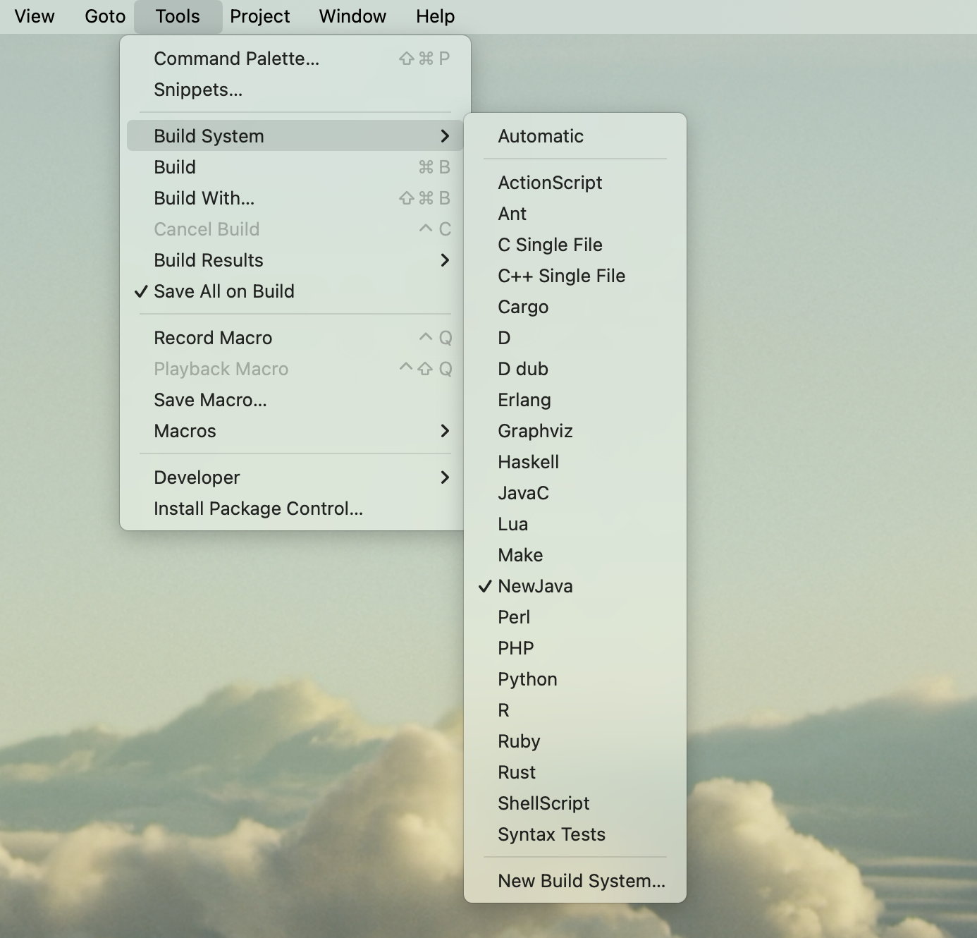 Sublime Text에는 JavaC 빌드 시스템이 존재하지만 컴파일만 하기 때문에 따로 실행을 해줘야 하는 번거로움이 있다. 따라서 편리한 문제풀이 환경을 구축하려면 새로운 빌드 시스템을 만들어줘야 한다.