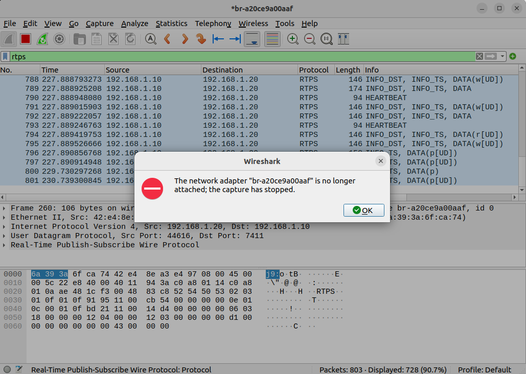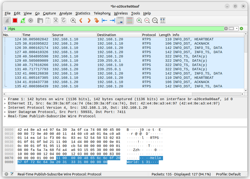 Wireshark를 실행하면 내가 만든 네트워크 인터페이스의 패킷을 조회할 수 있으며 UDP를 통해 RTPS 패킷이 교환되고 있음을 확인할 수 있다.