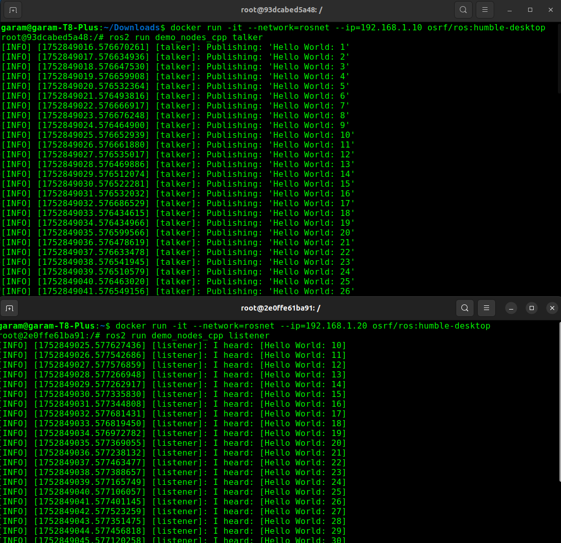 이후 같은 대역의 두 네트워크를 두 컨테이너에 할당해서 실행한다. 두 컨테이너 내부에서 각각 demo_nodes_cpp의 talker와 listener를 실행하니 예상대로 통신이 잘 되는것을 확인할 수 있었다.
