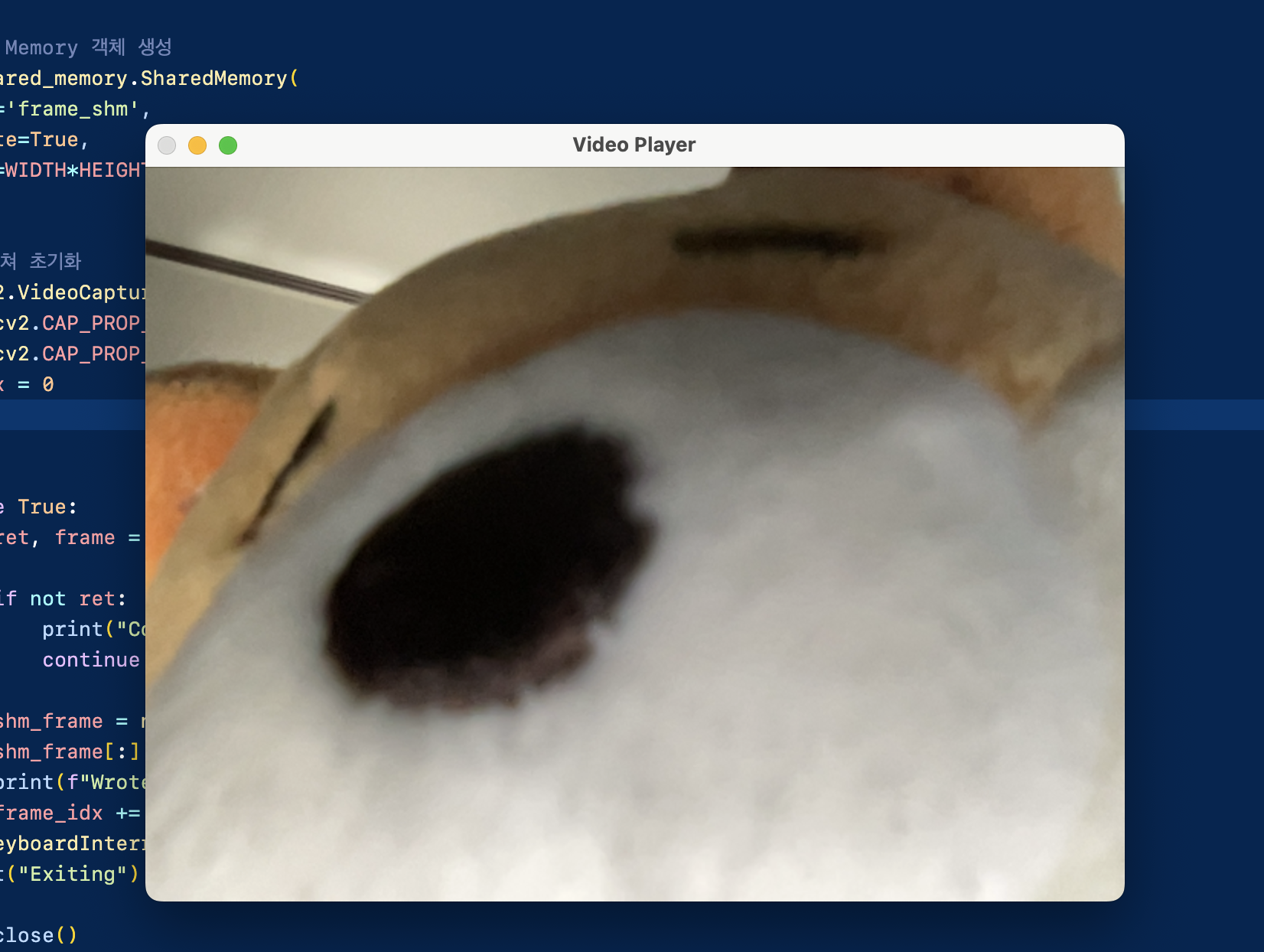 해당 Python 예제에서는 multiprocessing.shared_memory 모듈을 사용해 tx, rx 두 파일로 구성하였다. tx에서는 영상을 OpenCV로 캡쳐하여 실시간으로 이미지를 공유 메모리에 쓰고, rx에서는 해당 메모리에서 데이터를 읽어와 imshow로 띄운다.