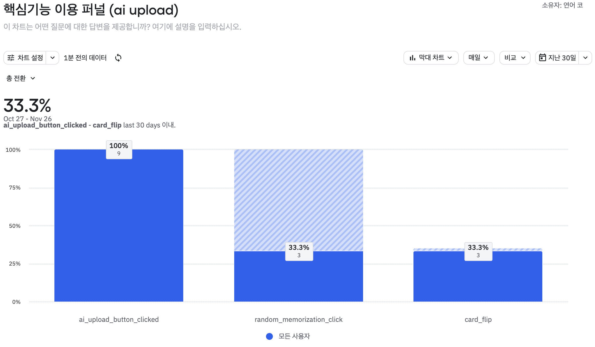모수가 작긴한데(9명) 메뉴 생성 → 랜덤 암기로 이어지는 전환율이 33%밖에 안 됐습니다 (11.25 기준).
