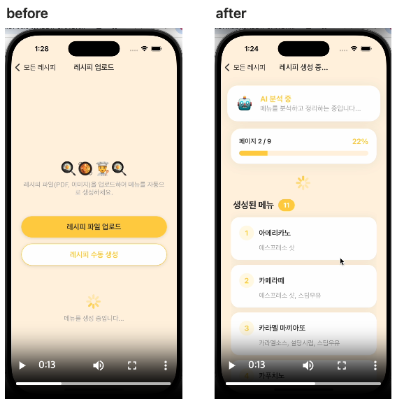 메뉴 생성에 2분이 걸려도 결국엔 쓸 사람은 쓸 거라 생각했습니다. 레시피를 외워야 하는 니즈가 크다고 생각했기 때문이었어요.