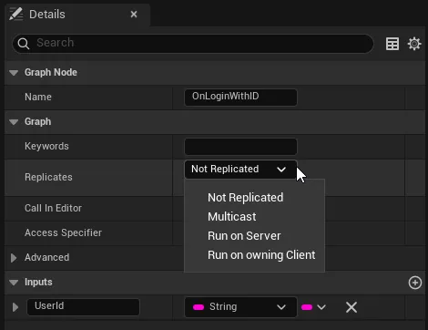 이벤트의 Replicates 속성을 Multicast, Run on Server , Run on owning Client로 설정하면,