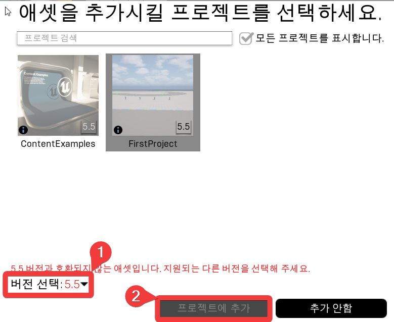 에셋 팩을 라이브러리에 추가했습니다. 근데 버전이 호환되지 않는다면