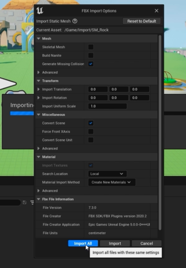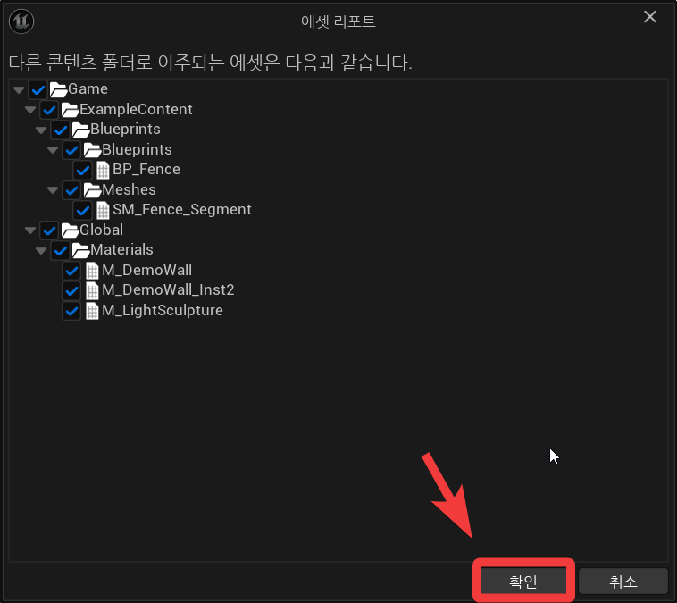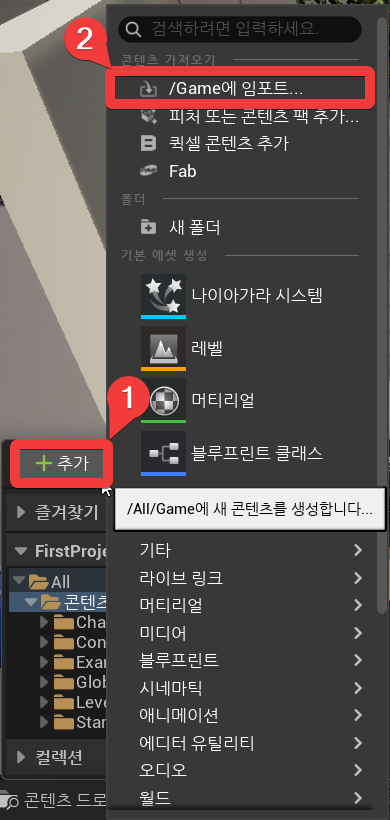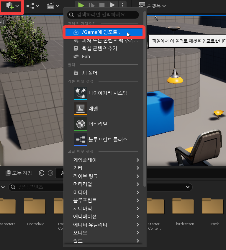 에셋을 바로 콘텐츠 폴더에 임포트할 수 있습니다.