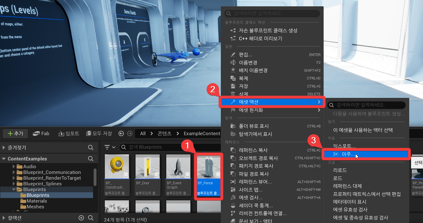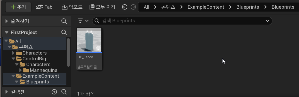 여기서 제가 선택한 BP_Fence라는 에셋은 Content라는 폴더에 저장해야 됩니다.