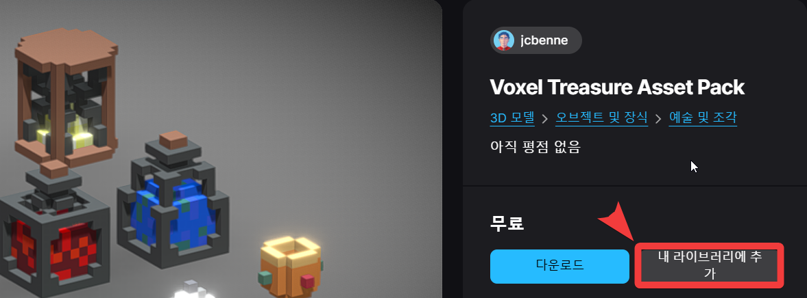 여기서 원하는 에셋 팩을 클릭하고 라이브러리에 추가 버튼을 누르면 됩니다.
