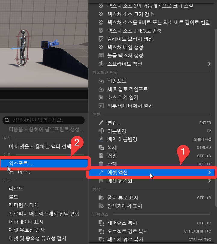 필요한 에셋을 찾고 우클릭을 누릅니다 → 에셋 액션에 들어갑니다