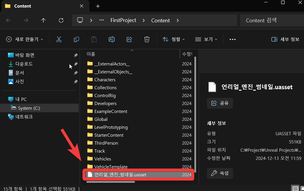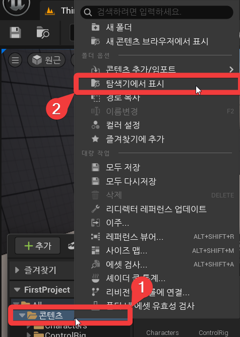 콘텐츠 브라우저의 콘텐츠 폴더를 클릭 후 탐색기에서 표시를 클릭합니다.