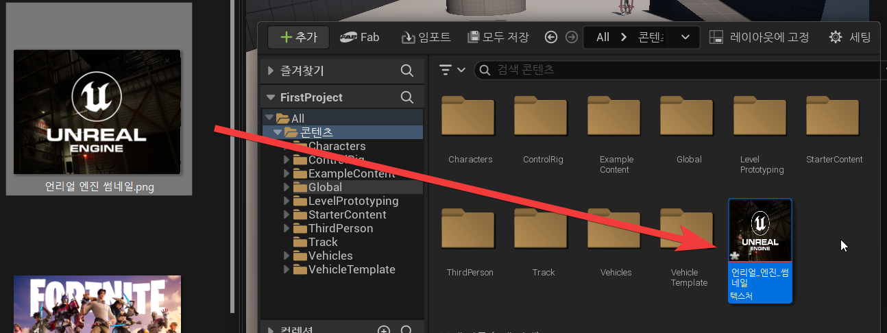 외부 파일을 콘텐츠 브라우저에 넣을 때는