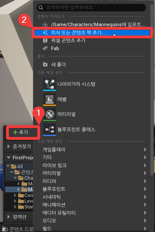 마켓플레이스나 다른 프로젝트에서 다운로드한 완성된 프로젝트에서 필요한 에셋을 꺼내오는 방식입니다.
