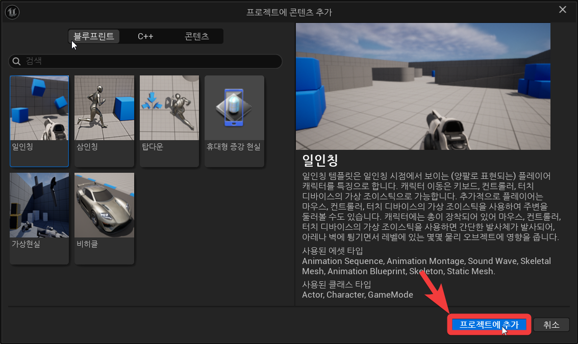 피처 또는 콘텐츠 팩을 추가합니다.이제 프로젝트 추가를 누르면 끝입니다.