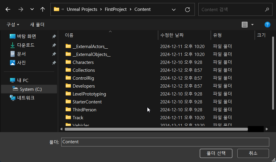 추가로 콘텐츠 브라우저에 밖의 폴더를 드롭다운 방식으로도 임포트가 가능합니다.