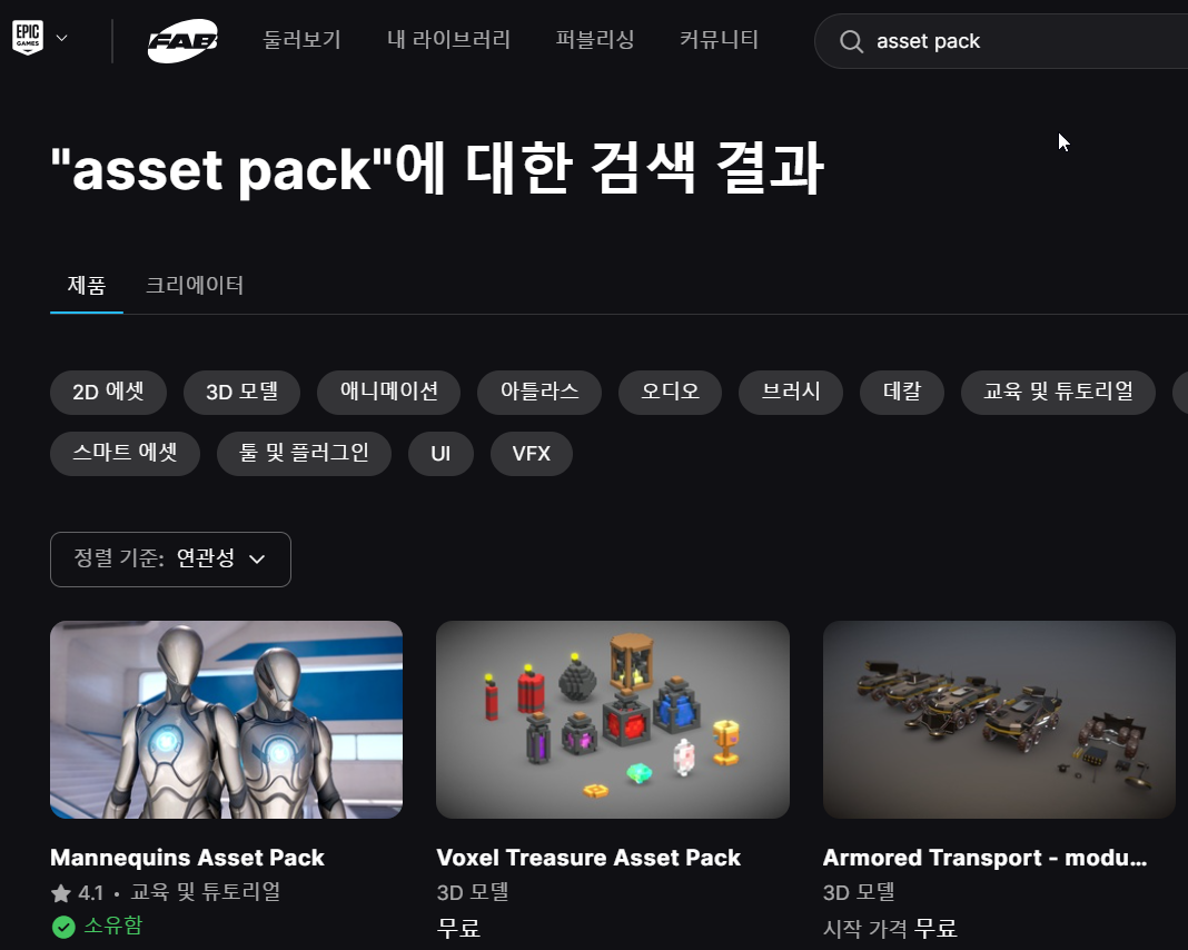 아래 사진처럼 Fab에서 검색하면 에셋 팩을 확인할 수 있습니다.