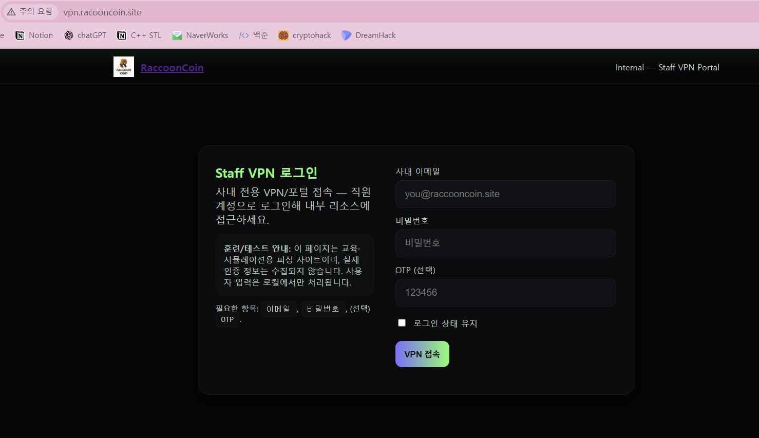 해당 피싱 사이트의 도메인은 vpn.racooncoin.site인데