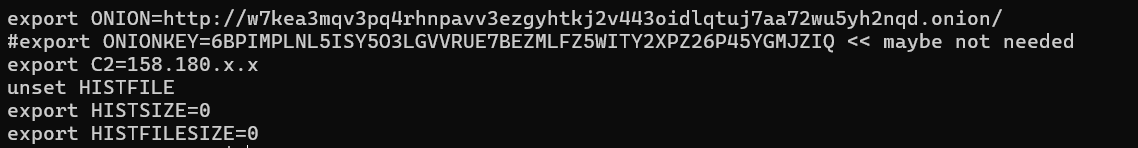 그래서 ls -a를 한 결과 나온 파일을 모두 읽어보던 중 .bashrc 파일을 읽어봤을 때, .onion 도메인을 가진 딱봐도 딥웹 링크가 있었다. 또한 C2 Server의 ip에 대한 힌트도 하드코딩 되어있었다.