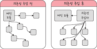 위의 그림처럼 메인 모듈이 직접 하위 모듈에 대한 의존성을 주는 것이 아니라, 중간에 의존성 주입자를 도입하여 메인 모듈이 간접적으로 의존성을 주입하게 한다.