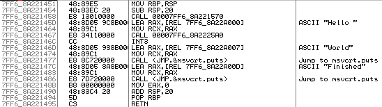 C 코드에서 printf를 3번 호출하였다. 자세히 보면 main 함수 내부에 call문이 3개가 존재하는데, Hello를 출력하는 call문만 다른 것을 확인할 수 있다. 이는