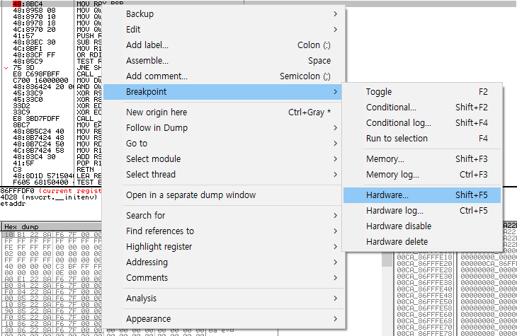 이번에는 hardware breakpoint에 대해서 알아보자. hardware breakpoint는 CPU 레벨에서 설정하는 breakpoint로, 디버그 레지스터는 특별한 레지스터가가 제공되며, 이 레지스터에 직접 조건을 거는 방식으로 breakpoint를 설정할 수 있다.