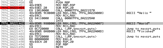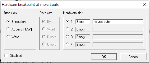World, Finished 출력은 new line이 있어 puts를 사용한 것을 볼 수 있다. puts 명령어에 hardware breakpoint를 걸어보자
