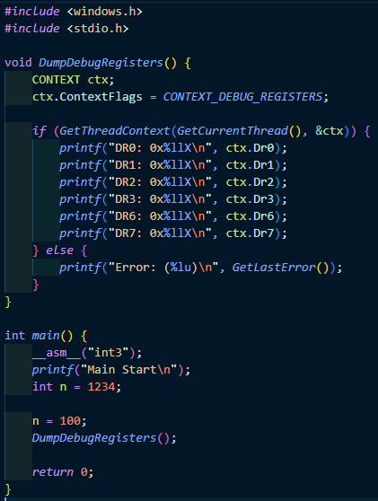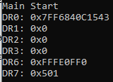 이렇게 뜨게 된다. 이번에는 DumpDebugRegisters 함수를 호출하기 전에 hardware breakpoint를 걸어보자