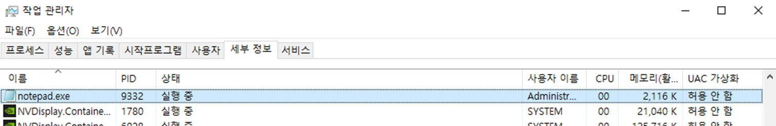 pid를 찾는 방법은 작업관리자의 세부정보를 보면 pid를 알 수 있다. 대상 프로그램은 위도우의 메모장으로 하였다.