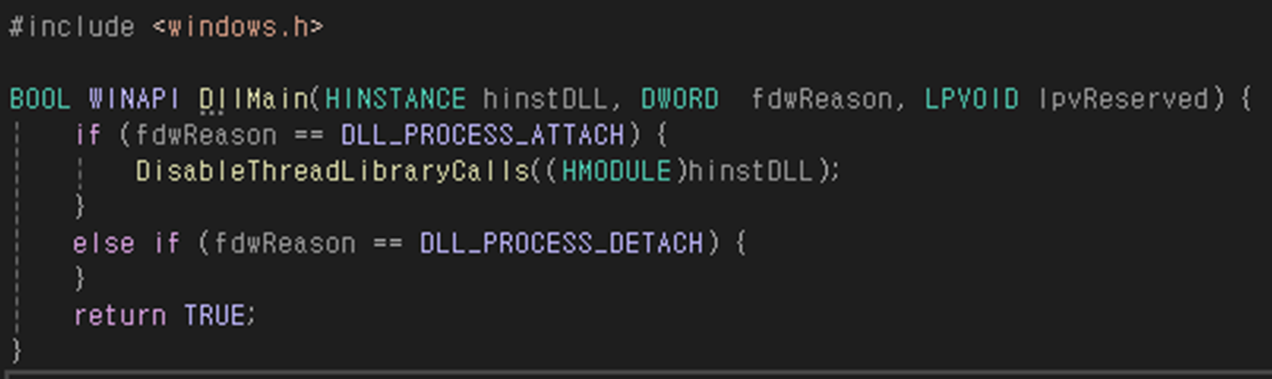 DLL은 간단하게 DllMain만 있는 코드를 작성하였다. 작성한 코드는 빌드를 통해 dll파일을 생성해 주었다.