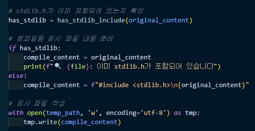 이 부분은 Tigress에서 난독화 할때 코드에 있어야 하는 헤더파일을 추가해 주는 부분이다. 이미 헤더파일이 존재한지 has_stdlib_include 함수로 확인 후 임시 파일을 생성하여 저장해 주었다.