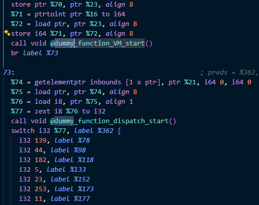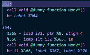 위 사진은 VM end 핸들러에서 분기된 블록인데 더미 함수 호출 명령어를 제외하면 단순 분기만 하는 블록이다. 이는 최적화가 적용되면 사라지게 되며 364번 블록이 VM end 핸들러와 합쳐지는 경우도 발생하게 된다. 그렇게 되면 VM end 핸들러와 original 코드가 구분되지 않게 된다.