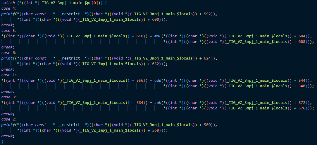 main 안에서 사용한 함수는 add, sub, mul, printf 이렇게 4개를 호출하였다. 하지만 swtich의 case문의 개수를 보면 6개 인것을 확인할 수 있다.