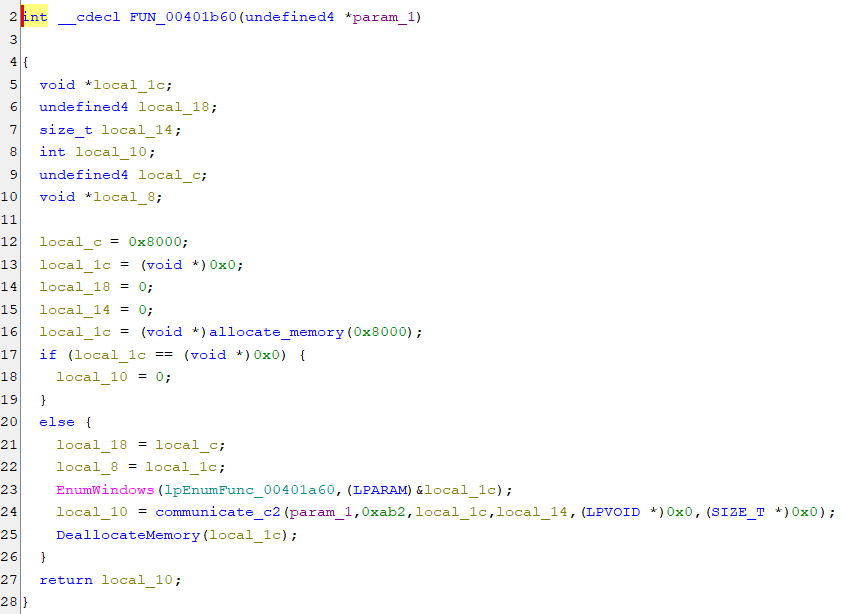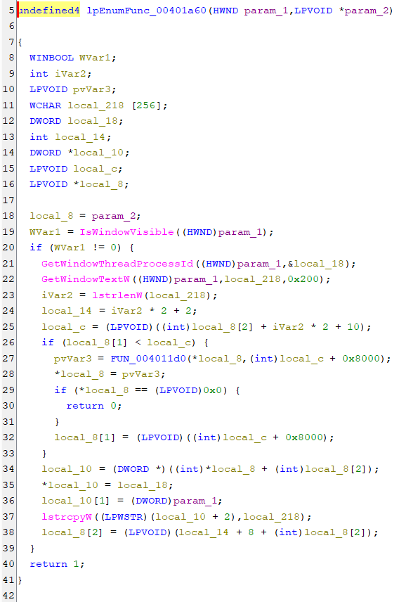 0x8000 바이트 크기의 버퍼를 할당한다.local_1c)를 EnumWindows 함수의 인자로 전달하여 콜백 함수가 데이터를 기록할 수 있게 한다.EnumWindows API를 통해 현재 시스템의 모든 최상위 윈도우를 순회한다.lpEnumFunc_00401a60 콜백 함수를 호출하여 창 제목 등의 세부 정보를 버퍼에 채운다.0xab2 식별자와 함께 C2 서버로 전송한다.DeallocateMemory)를 해제하여 시스템 리소스를 정리한다.콜백 함수 lpEnumFunc_00401a60를 분석해 보자.