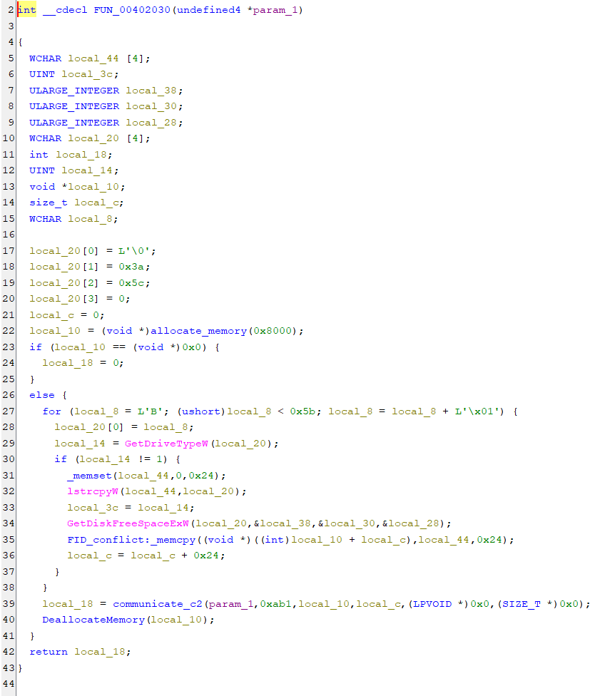 해당 함수는 감염된 시스템의 드라이브 정보를 수집하여 C2 서버로 전송하는 기능을 수행한다.