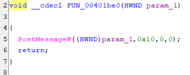 PostMessageW는 특정 창의 핸들을 대상으로 메시지를 보낸다. 상수로 들어가 있는 인자를 분석하면 0x10은 WM_CLOSE를 의미한다. 공격자가 틍정 창의 핸들을 알아낸 뒤 이 함수를 호출하여 해당 프로그램 창을 닫는 동작을 수행한다. 첫 번째 인자는 HWND(창의 고유번호)가 된다.