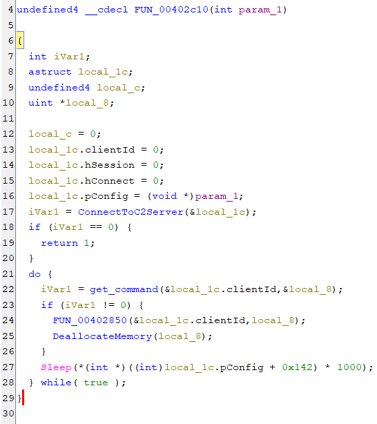 이 함수는 백도의 명령처리기다. C2 서버로부터 받은 명령 코드에 따라 어떤 악성 동작을 수행할지 결정한다.