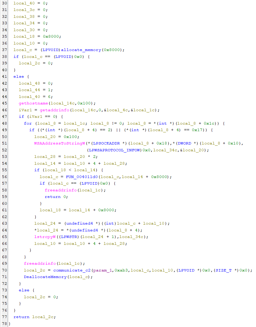 해당 함수는 감염된 PC의 로컬 IP 주소 정보를 수집하여 C2 서버로 전송하는 기능을 수행한다.
