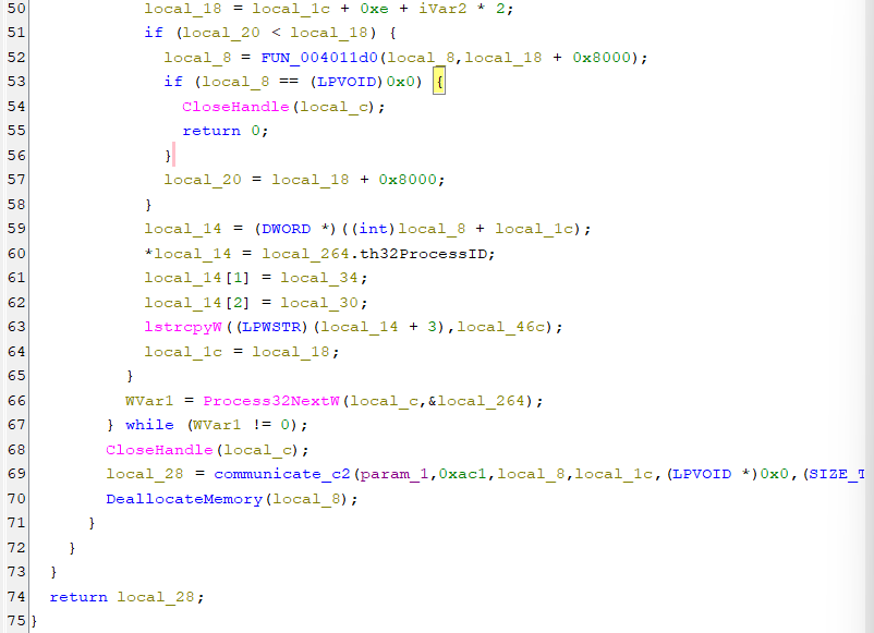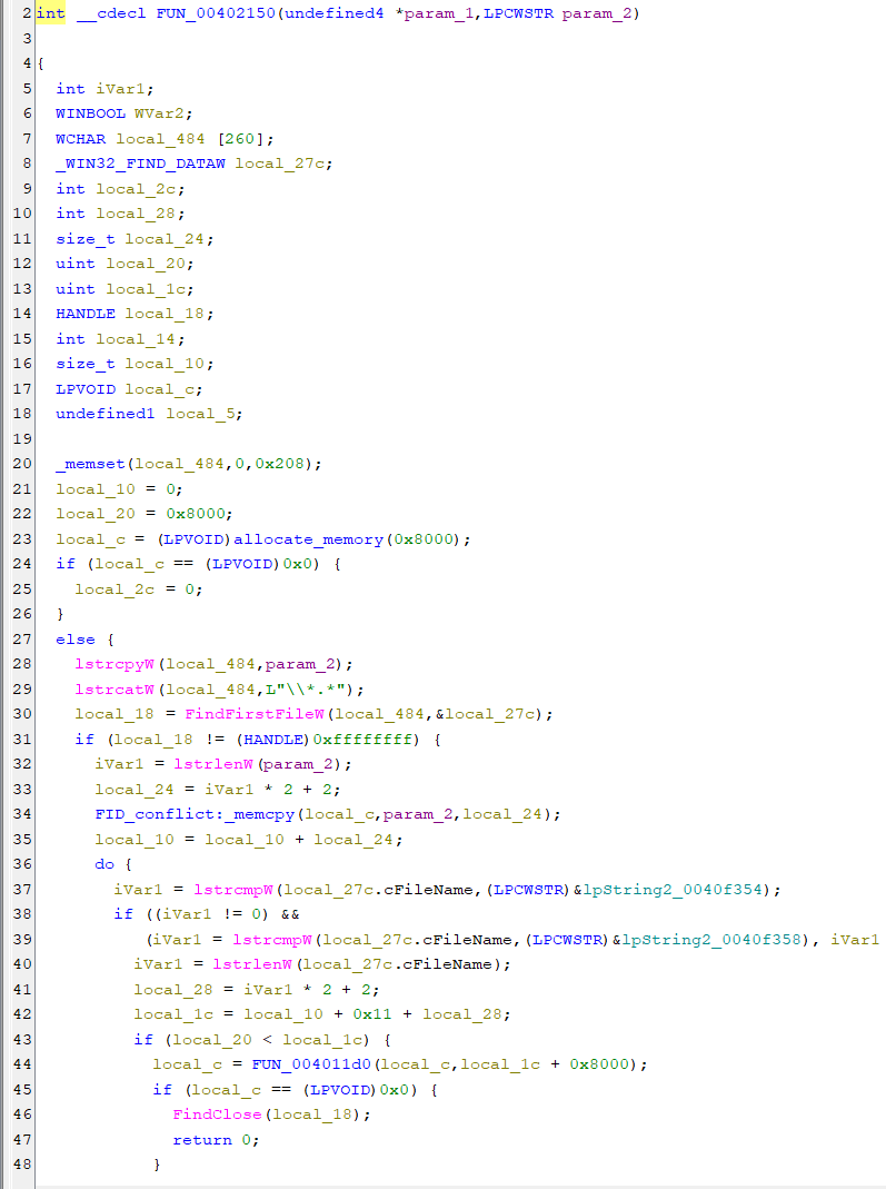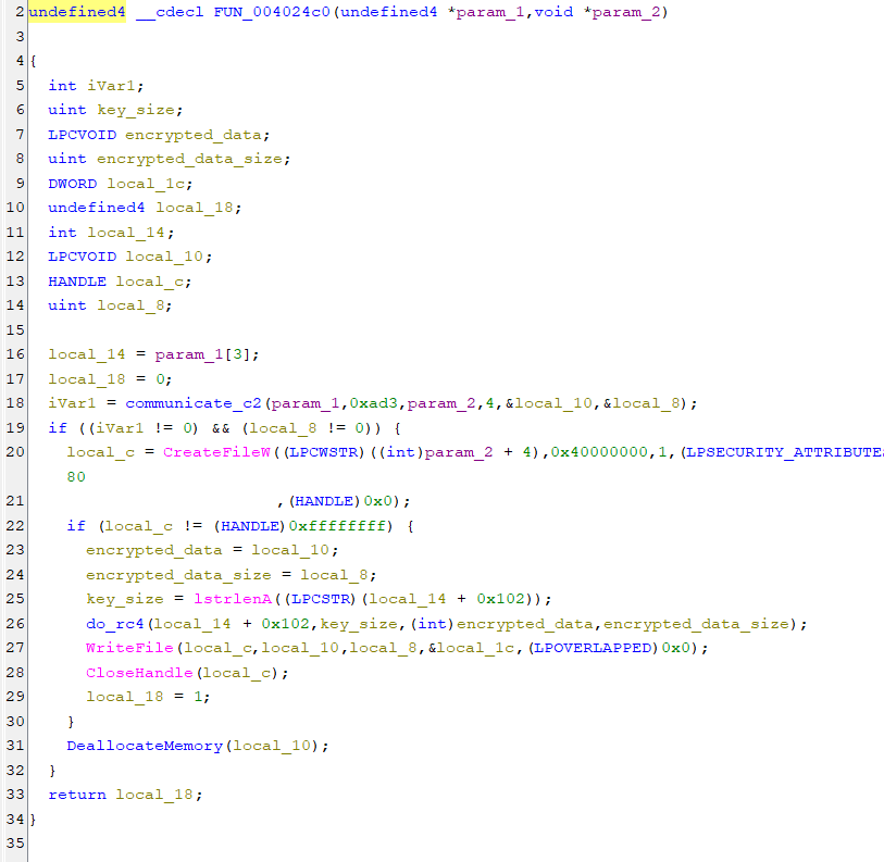 C2 서버로부터 파일 다운로드 및 복호화하는 기능을 수행한다. 암호화하여 파일을 전송하는 이유는 네트워크 탐지를 피하기 위함이다. 수신받은 파일은 RC4 암호화가 적용돼 있기 때문에 이를 복호화하는 로직이 존재한다.
