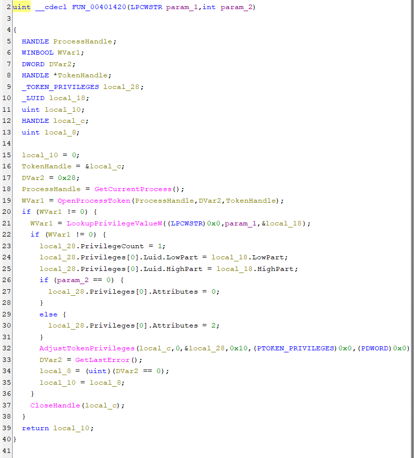 해당 함수인데, 윈도우에서 SeDebugPrivilege는 다른 사용자가 실행한 프로세스의 메모리까지 접근할 수 있는 아주 강력한 권한이다. 이 함수는 현재 실행 중인 프로세스의 토큰 권한을 활성화하거나 비호라성화하는 권한 조정 유틸리티 함수다.