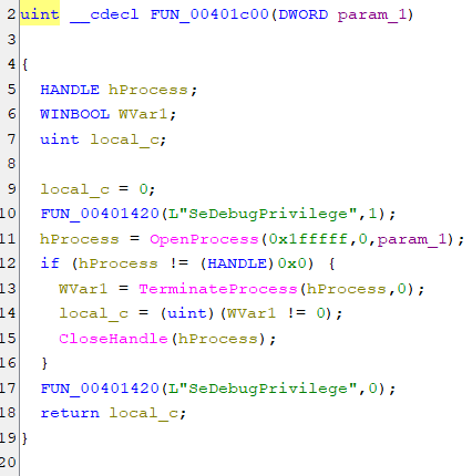 다시 이전 함수를 분석하면 권한을 획득하고, 타겟 프로세스 핸들을 연 다음 프로세스를 강제 종료하는 동작을 수행한다.