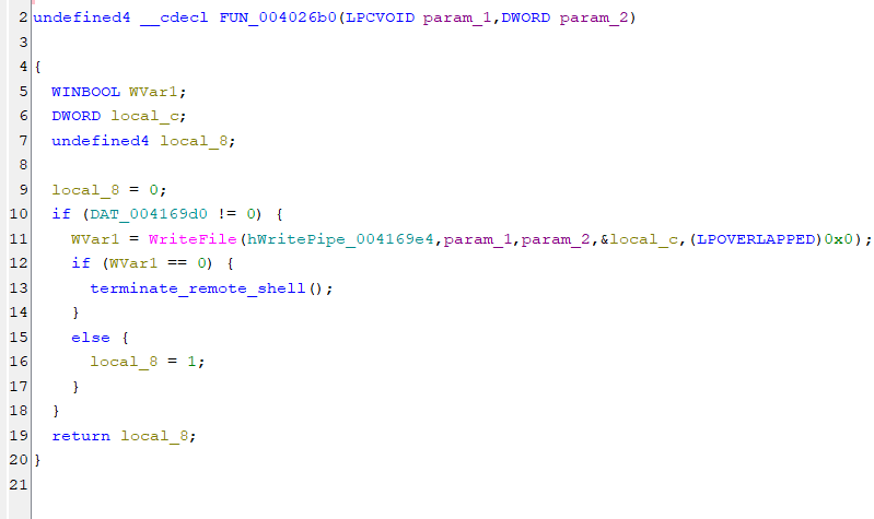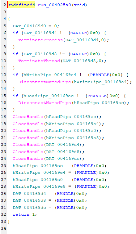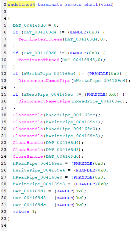 이 함수는 원격 쉘의 잔재를 청소하는 역할을 수행한다. 특정 프로세스와 스레드를 찾아서 강제로 죽이고, 프로세스 간에 데이터를 주고받는 통로인 파이프 연결을 해제한다. 마지막으로 모든 핸들을 닥고 전역 변수 초기화를 한다.