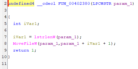 MoveFileW를 호출하는 것을 볼 수 있다. 첫번째 인자는 대상 파일 경로, 두번째 인자는 대상 파일 경로를 지정한다.