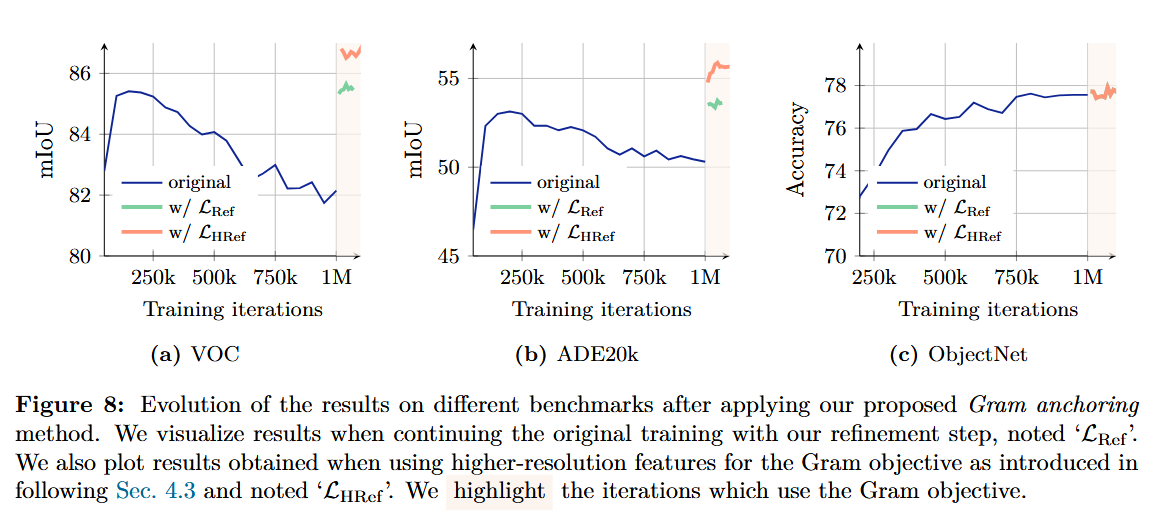 - 두 번째 훈련 phase(refinement) (1만 회 마다 Gram 교사를 메인 EMA 교사와 동일하게 바꿈):