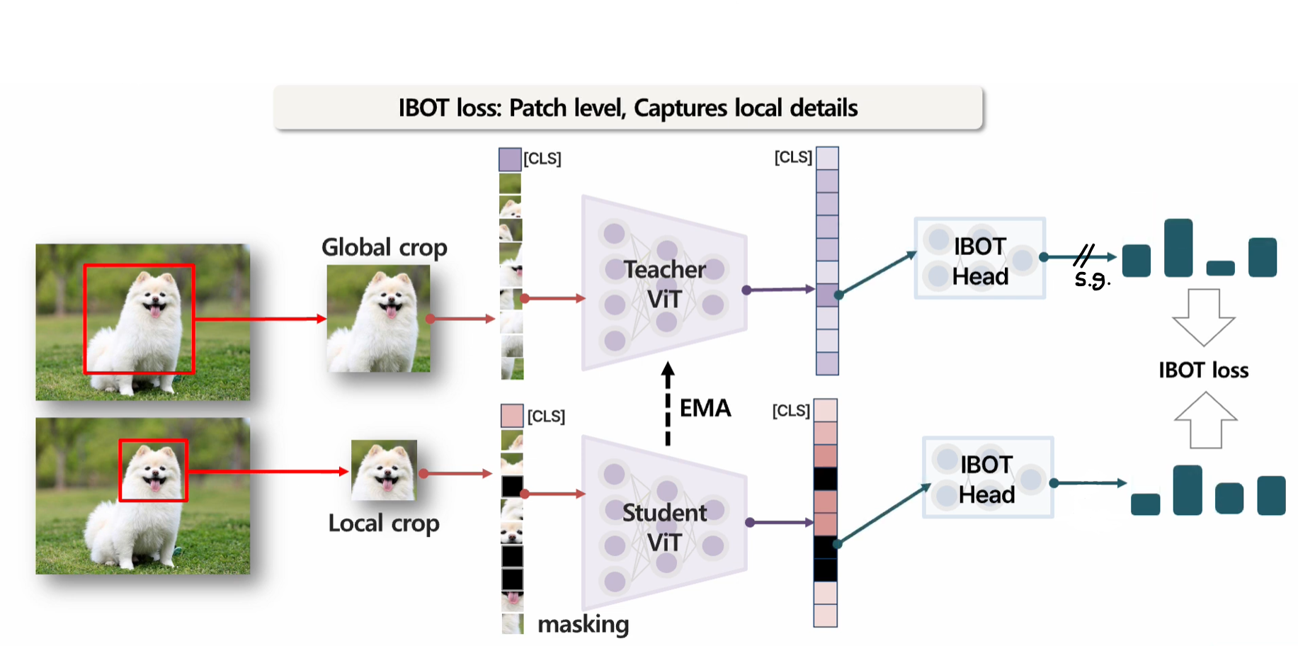 학생이 보는 전역 크롭 패치 토큰 중 사이의 무작위 비율을 50% 의 확률로 마스킹하며, 이들과 교사 EMA 가 보는 가시적 토큰 사이에 손실을 적용합니다.