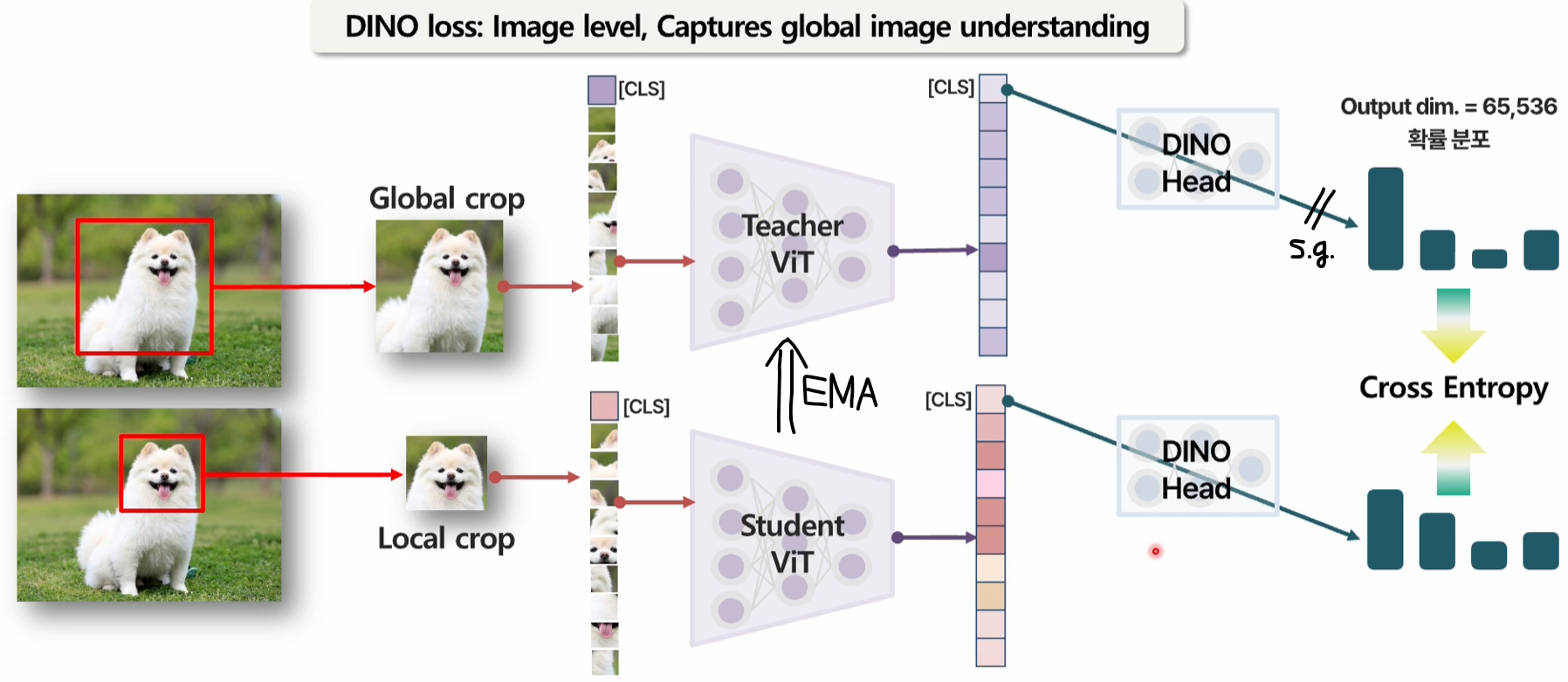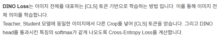 - (Image-level Objective): 이미지 전체를 대상으로 하는 손실 함수입니다. 이미지의 글로벌 특징(Global Features)을 학습하며, 서로 다른 뷰(View)의 이미지가 유사한 특징을 갖도록 유도하는 이미지 단위 의 목표를 가집니다.